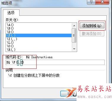 第三步:點(diǎn)擊“添加到域”,然后域代碼處,填寫分子和分母的數(shù)值,如下圖,數(shù)字“1”的位置是分子,數(shù)字“2”的位置是分母。