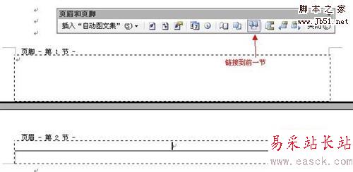3、在上圖中可看到,紅色框內(nèi)“與上一節(jié)相同”,表明兩節(jié)的格式和內(nèi)容是一樣的。若想讓兩節(jié)的格式不一樣,點(diǎn)擊“鏈接到前一節(jié)”按鈕,之后“與上一節(jié)相同”幾個(gè)字會(huì)消失,此時(shí)兩節(jié)則是獨(dú)立的,不一樣的。就可以單獨(dú)插入格式不同的頁(yè)眉和頁(yè)碼。