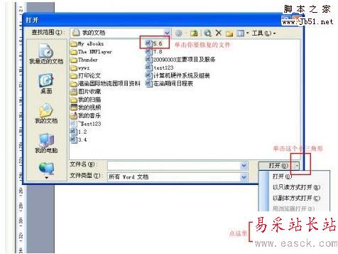 第二步:點擊word軟件左上角的 文件-打開,找到你損壞掉了的那個文件的路徑,比方說我要恢復的是5.6.doc這個文件,那么用鼠標點擊一下它,注意,是點擊一下,不是雙擊。
