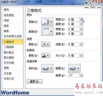 圖2010110502 選擇“三維選項(xiàng)”命令打開Word2010“設(shè)置圖片格式”對(duì)話框,在“三維格式”選項(xiàng)卡中對(duì)棱臺(tái)頂端和底端的寬度和高度進(jìn)行設(shè)置,設(shè)置完畢單擊“確定”按鈕,如圖2010110503所示。