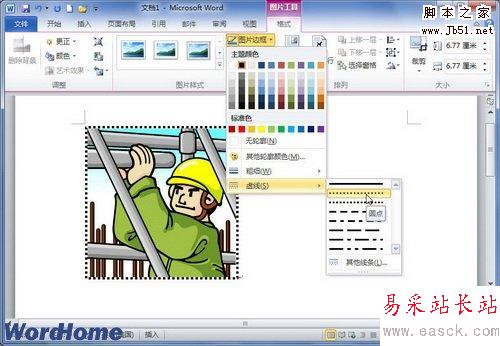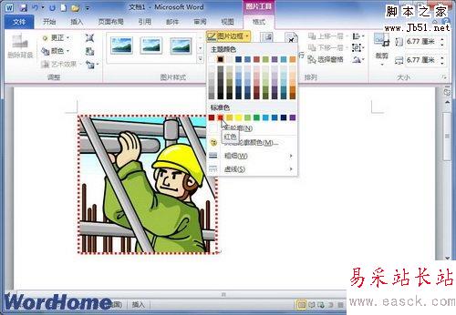 第4步,在“圖片邊框”列表中單擊需要的邊框顏色,則被選中的剪貼畫將被應(yīng)用所設(shè)置的邊框樣式。如果希望取消剪貼畫邊框,則可以單擊“無輪廓”命令,如圖2010110803所示。