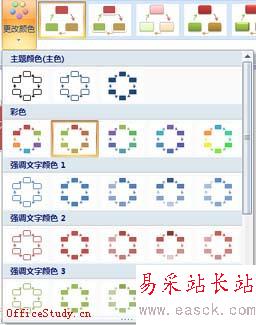 在選中SmartArt圖形時,工具欄上就會出現“SmartArt工具”,下面還有“設計”與“格式”兩大功能區,可以對圖形進行美化操作。在“設計”工具中,可以對圖表的色彩風格進行設置(如下圖),只要鼠標移至模板上方就可以看到效果,十分方便。