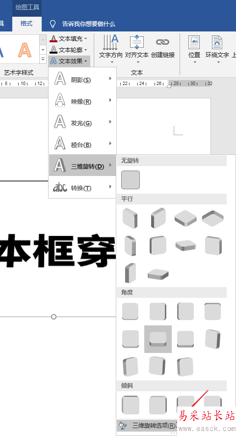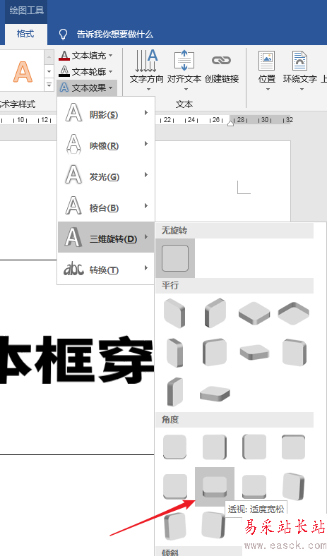 3、選中文本框,點擊【繪圖工具】—【格式】—【文本效果】—【三維旋轉】—【透視:適度寬松】。