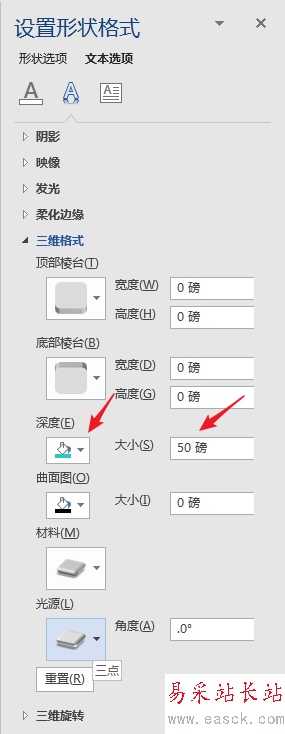 6、在右側打開的設置窗口中,點擊【三維格式】,在【深度】中選擇一種顏色,并設置深度大小。