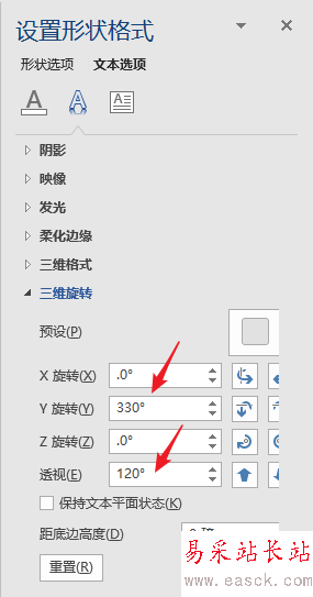 8、然后點擊【三維旋轉】,在【Y旋轉】和【透視】中修改數值。