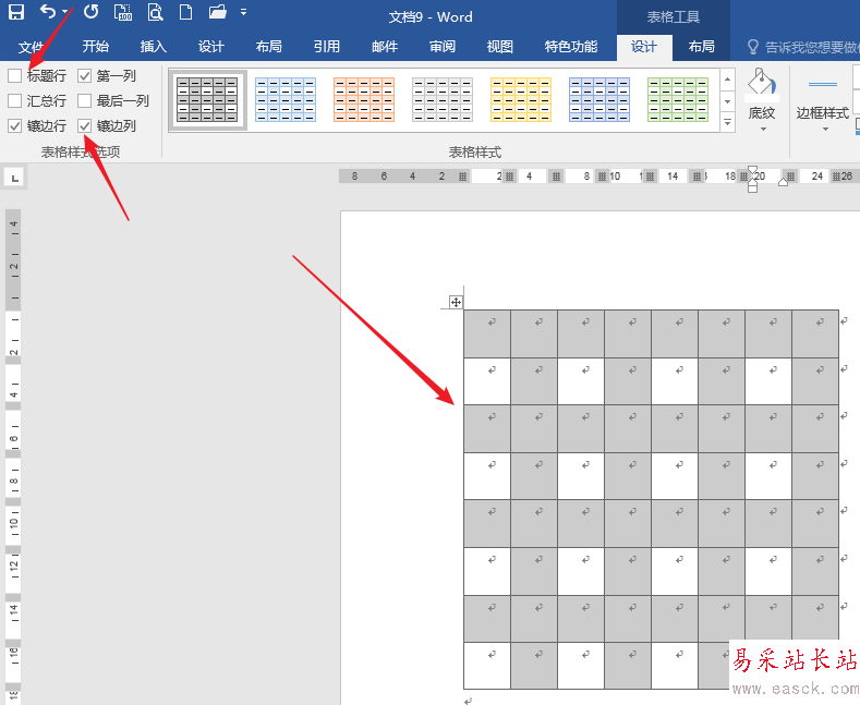 6、光標置于表格,點擊【設計】,在【表格樣式選項】中取消勾選【標題行】,并勾選【鑲邊列】,則表格已經具備了棋盤的雛形。