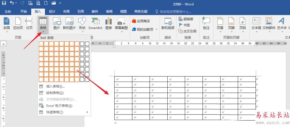 2、點擊【插入】—【表格】,繪制一個表格,比如需要繪制8行×8列的棋盤,則插入一個8×8的表格。