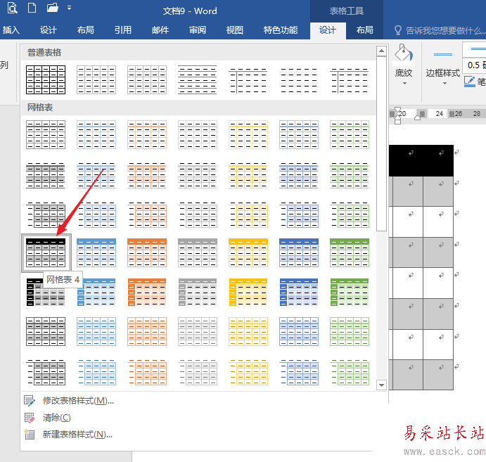 4、光標置于表格中,點擊【設計】—【表格樣式】中的【網格表4】內置表格樣式。