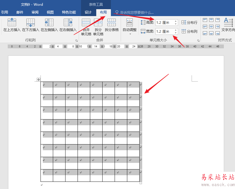 3、棋盤的格子都是正方形的,所以全選表格,在【布局】的【單元格大小】中把單元格高度和寬度輸入相同的數值。