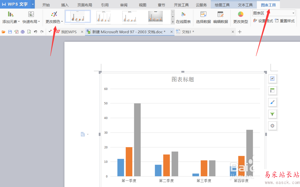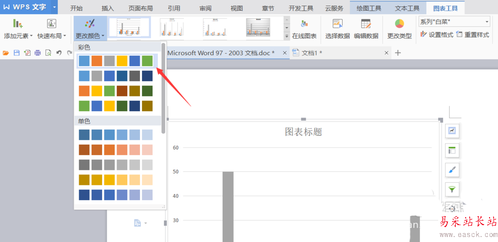 3、如圖所示,菜單欄內出現菜單“圖表工具”菜單--"更改顏色“。