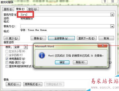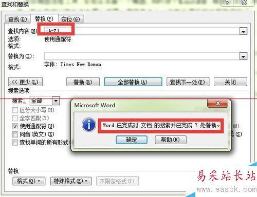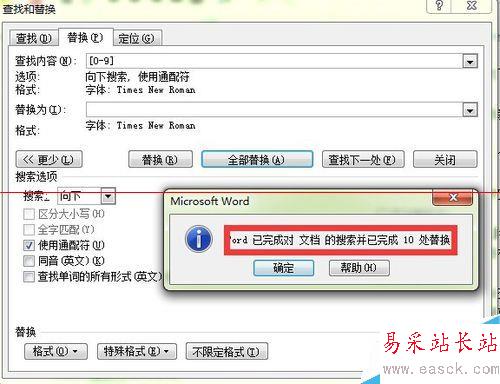 6、確定選擇新羅馬字體后,在“替換”頁面點擊“全部替換”,這時系統會提示所有的數字被替換為新羅馬字體。