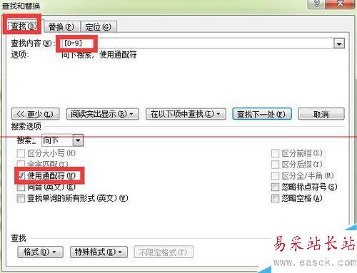 3、進入查找的頁面后,在“查找內容”一欄輸入【0-9】,意思是需要查找所有的數字,然后勾選下面“使用通配符”的選項。