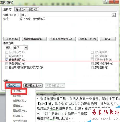 4、然后選擇“替換”一項,在“替換”的頁面中,選擇頁面下方的“格式”-“字體”,因為我們修改的是字體而不是文本。