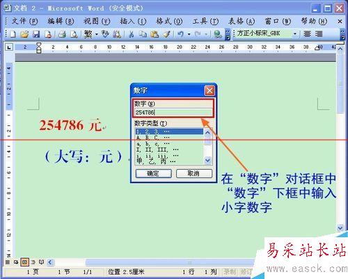 第四步:在“數字”對話框中“數字”下框中輸入小字數字。