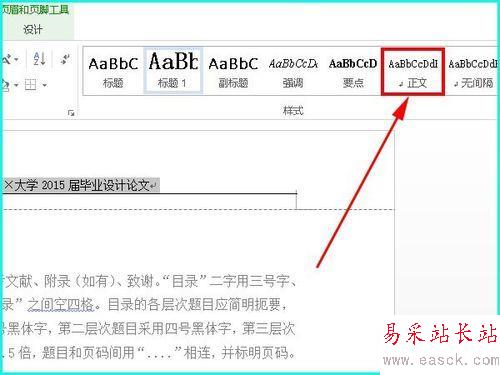 4、在文檔樣式中選擇“正文”樣式:單擊“開始”選項后,我們可以在菜單欄右側看到文檔樣式選項,此時我們需要選中“正文”樣式其位置如下圖1所示,“正文”樣式選中后頁眉線消失頁眉內容移至左側如下圖2所示。
