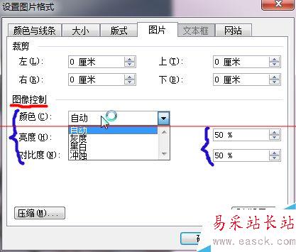 3、本次主要對(duì)“圖像控制”進(jìn)行調(diào)節(jié),“圖像控制”中包含顏色、亮度和對(duì)比度選項(xiàng)。“顏色”選項(xiàng)中包含自動(dòng)、灰度、黑白和沖蝕;“亮度”和“對(duì)比度”主要進(jìn)行百分比調(diào)整。