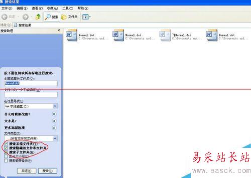 4、如果實在找不到,“開始”--->“搜索”,然后在左側選擇“所有文件和文件夾”,出現下圖,在“全部或部分文件名”內輸入“Normal.dot”,記得把下方的三個選擇框都勾上,不然搜索不出來