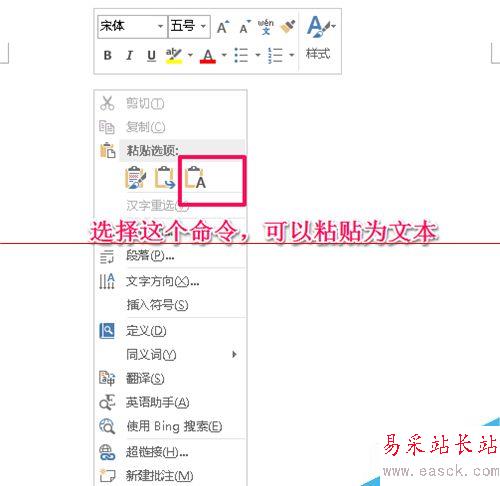 3、在“粘貼選項”中選擇最后一項,將復制的內容只粘貼為文本。這樣就可以去掉網頁中的文字格式了。