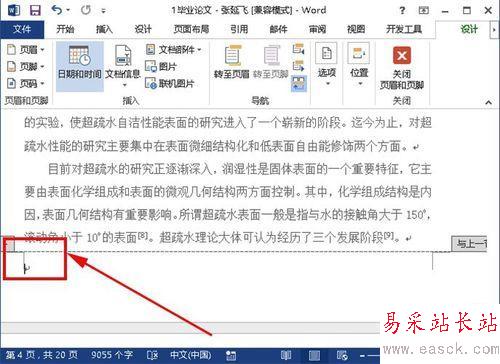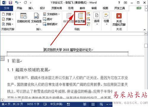 步驟4完成后,我們要在該文檔界面下找到“轉至頁腳”命令如下圖中紅色框所在處,單擊該命令,然后我們會發現鼠標光標移動到上述第一頁文檔的頁腳位置如下圖2所示。