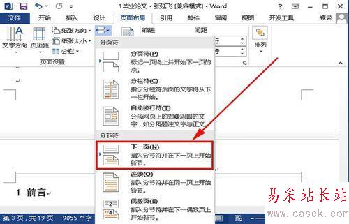 單擊“頁面布局”選項后我們會看到出現了一個下拉列表,此時我們在該下拉列表中找到“下一頁”命令如下圖紅色框選中位置,單擊該命令,然后我們會發現在我們選擇的第一頁前面出現了一個空白頁如下圖2所示。