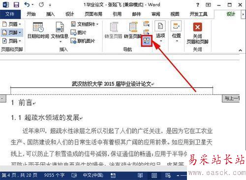 接下來我們需要在文檔界面上找到“鏈接到前一條頁眉”命令如下圖紅色框選中位置,然后單擊該命令。