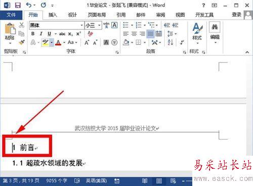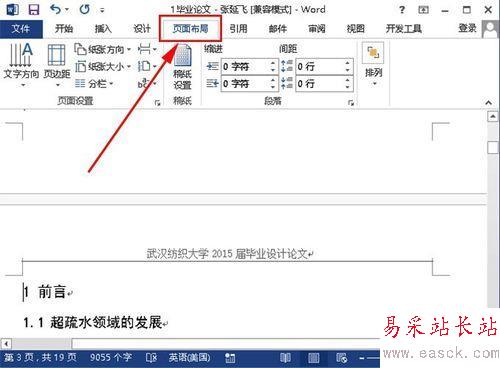 首先,我們去打開那篇待編輯的文檔,翻到等會頁碼要設置為1的那一頁,然后我們將鼠標的光標置于這一面第一個字的前面如下圖紅色框選中處。再然后在該界面上方找到“頁面布局”選項如下圖2中紅色框選中處。