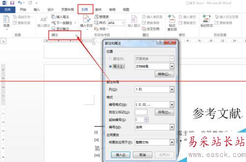 點擊工具欄中的【引用】選項卡,然后點擊菜單欄下方工具欄中【腳注】組右下腳的折疊框按鈕,這樣就會彈出【腳注和尾注】對話框