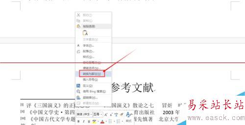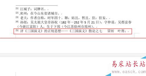 比如我現(xiàn)在要將尾注中的第一條尾注轉(zhuǎn)化為腳注,那么首先將光標定位在這一行文字所在的行,然后點擊鼠標右鍵