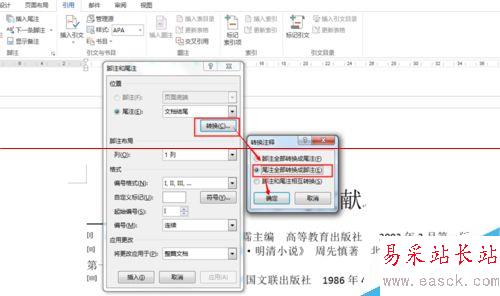 點擊【腳注和尾注】對話框中的【轉(zhuǎn)換】按鈕,接著在【轉(zhuǎn)換注釋器】中點選【尾注全部轉(zhuǎn)換為腳注】,然后點擊【確定】