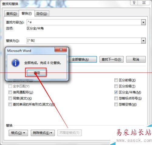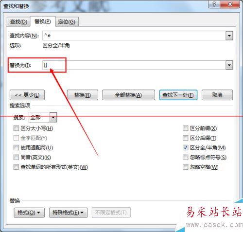 5、接著將光標定位在【替換為】一欄中,在該欄中輸入英文半角狀態下的中括號[];接著講光標定位在中括號中間。