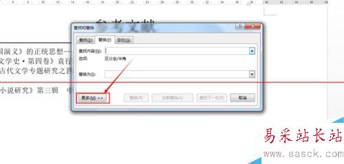 3、在彈出的【查找和替換】對話框中將鼠標定位在【查找內容】中,然后點擊下方的【更多】按鈕