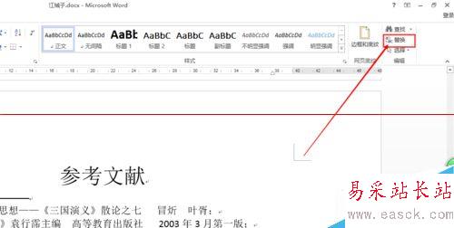 2、然后點擊【開始】下方工具欄中的【替換】按鈕,或者使用組合鍵CTRL+H,彈出【查找和替換】對話框,如圖所示