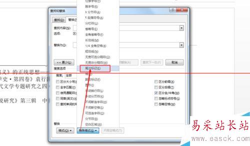 4、然后點擊【特殊格式】,在彈出的菜單中選擇【尾注標記】,如圖所示