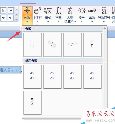 2、選擇“分數”公式。插入新公式后,菜單欄會顯示各種公式類型,選擇分數即可。