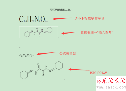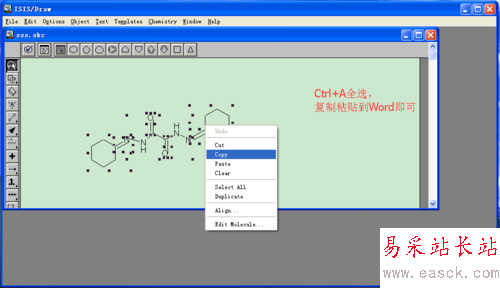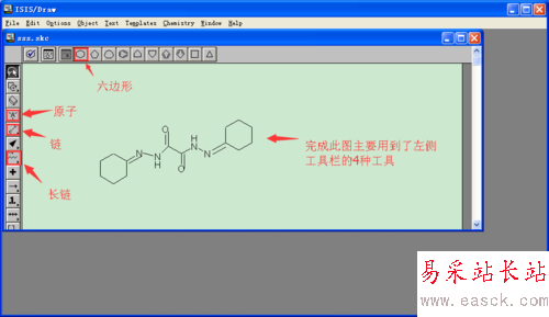 ISIS DRAW很好用,和系統自帶的畫圖差不多,直接點擊所需要的形狀,在合適的位置放置即可。如本例中”雙環己酮草酰二腙”的完成主要用到了左側工具欄的四種工具。保存文件,以備用。
