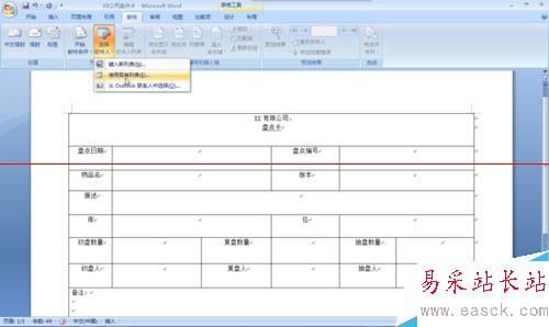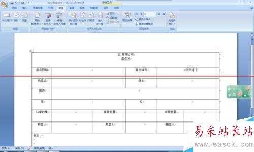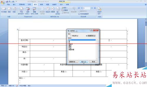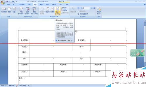 6、將光標(biāo)定位“盤點(diǎn)卡編號(hào)”右側(cè)的單元格中,單擊【編寫插入域】的【插入合并域】,如圖7 、8所示。