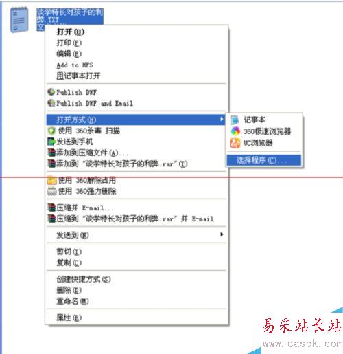 8、找到你剛剛保存的TXT格式文件,鼠標右鍵點擊“打開方式”--“選擇程序”。
