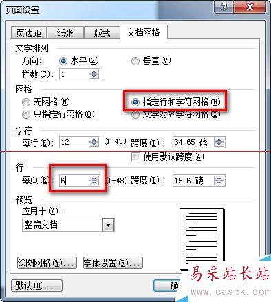 6、接下來(lái)是設(shè)定每頁(yè)行數(shù),同樣的操作,選擇word菜單欄中的“文件”-“頁(yè)面設(shè)置”-“文檔網(wǎng)絡(luò)”,選擇“指定行和字符網(wǎng)格”然后在“行”中輸入每頁(yè)的行數(shù),如圖所示,確定之后回到頁(yè)面可以看到設(shè)定成功。