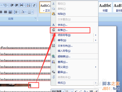 步驟二:把光標(biāo)位置置于圖片的末尾,然后點(diǎn)擊鼠標(biāo)右鍵,進(jìn)入“段落”選項。
