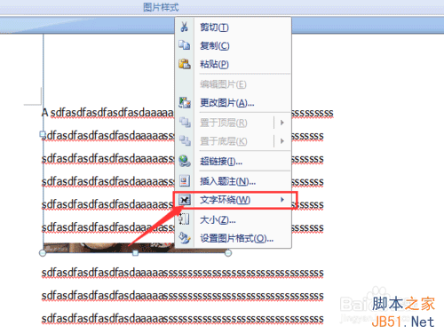 步驟六:還有一種解決方案是:選中圖片,點(diǎn)擊鼠標(biāo)右鍵,選擇文字環(huán)繞。