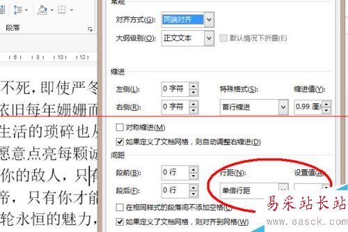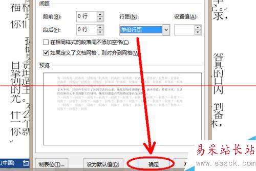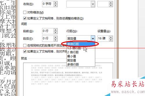 6、點擊行距旁邊的下拉框按鈕,然后選擇單倍行距,或者1.5倍行距等等.這里以單倍行距為例.如圖
