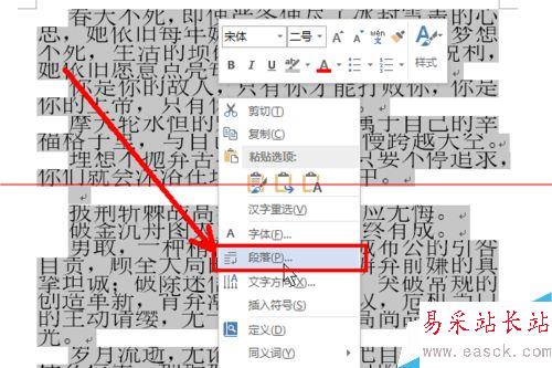 4、在選中的文字上面右擊鼠標,然后選擇段落,如圖所示.