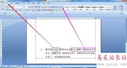 最后在“開始”菜單中點擊顯示/隱藏“段落標記符”命令,隱藏所有“段落標記符”,則新的空白頁也就不見了。達到相應的效果。以后在進行打印時再也不用擔心會打印出空白頁出來了。
