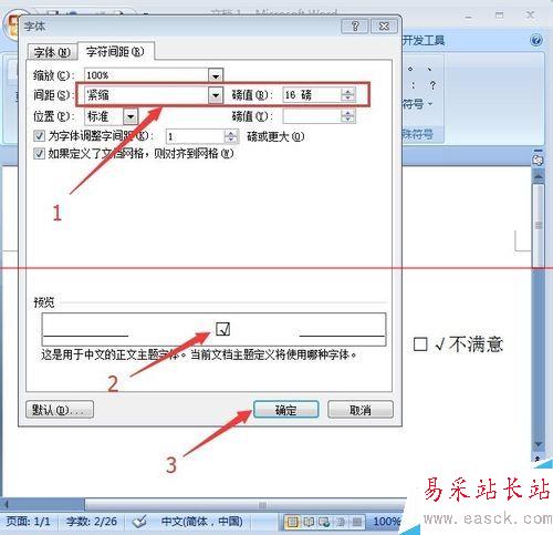 9、間距項選擇“緊縮”項,磅值大概調至“16磅”,看下面的預覽欄,兩個符號已經在一起了,最后點擊確定。如圖所示。