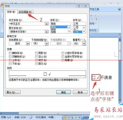 10、退出字體編輯菜單,回到原來的Word文檔中,你會發現,你剛才打的鉤已經在小方框內,說明設置成功了。如圖所示。