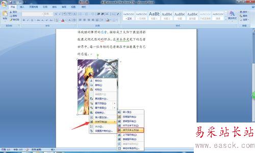 4、所以我們就要對圖片進行一些設置。右鍵單擊已經插入的圖片,選擇文字環繞——浮于文字上方。