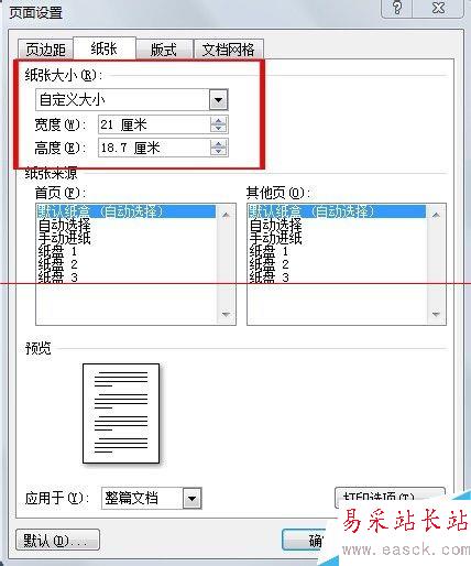 4、在“紙張大小”處選擇“自定義大小”,將你需要打印的紙張寬度、高度按測量的長度填入,“確定”。