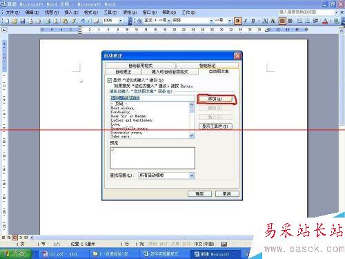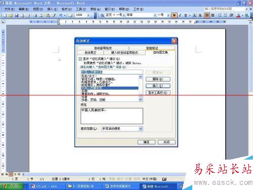 4、在“自動圖文集”詞條框中錄入“中國人民解放軍”,點擊右側的“添加”