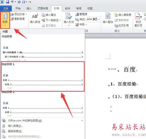 5、在“引用”菜單下的工具欄中,點擊左側的“目錄”工具,在彈出來的選項菜單中,點擊“自動目錄1”或者“自動目錄2”。(如下圖)