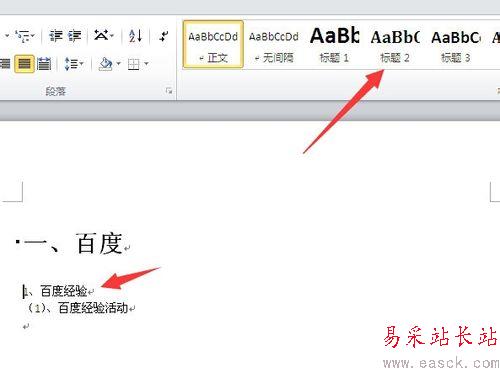 2、接著再把輸入符放到二級標題上面,再點擊頂部目錄索引框中的“標題2”。(如下圖)